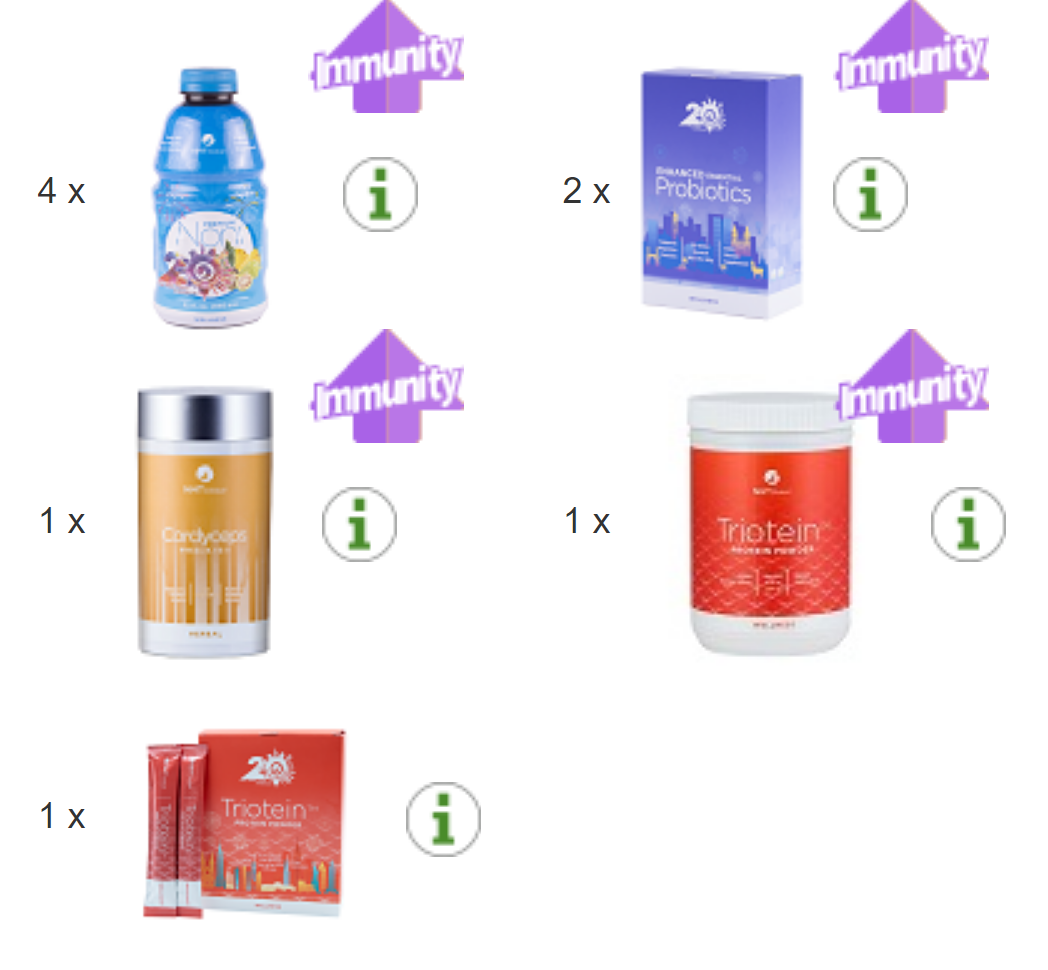 Package contains 1 Cordyceps, 2 Enhanced Essential Probiotics, 1 Triotein, 1 Triotein Stick Pack and 4 Premium Noni Juice.