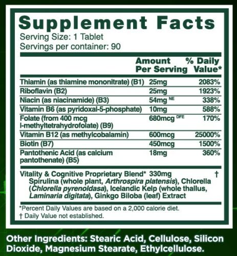 Vitamin B1 (Thiamin mononitrate), Vitamin B2 (Riboflavin), Vitamin B3 (Niacinamide), Vitamin B5 (Pantothenic Acid), Vitamin B6 (Pyridoxal-5-phosphate), Vitamin B7 (Biotin), Vitamin B9 (Folate), Vitamin B12 (Methylcobalamin), Spirulina, Chlorella, Icelandic Kelp, Ginkgo Biloba (Leaf) Extract